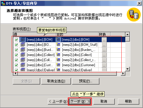 | 6. 选择要复制的表和视图,点“下一步”继续 | |